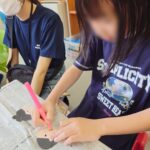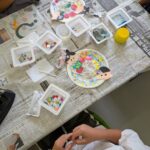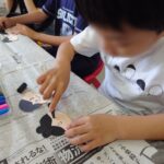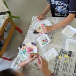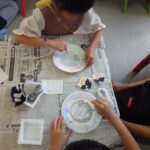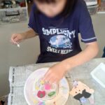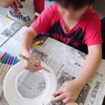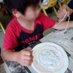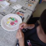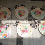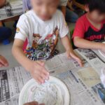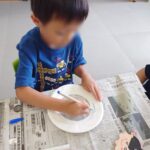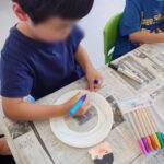 ➀初めにスタッフの説明を聞いてから紙皿のふちにペンでお絵かきをしてもらいました。
