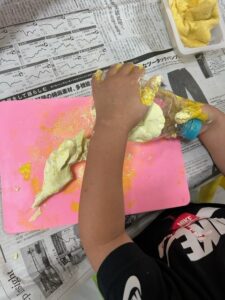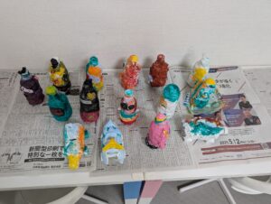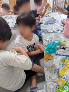 未就学のお友達は、着色した紙粘土をペットボトルに貼り付け