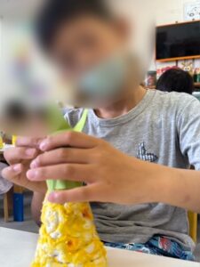紙粘土を細く巻き付けたお友だちが「これやったらパイナップルじゃなくてトウモロコシやん!」と笑いを誘ったり…