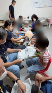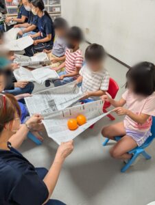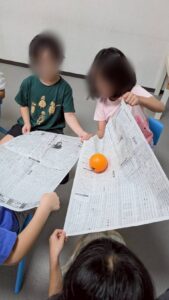 力加減に注意し新聞紙(チラシ)が破けない様に上手に風船とボールを運べていました。