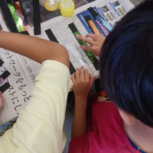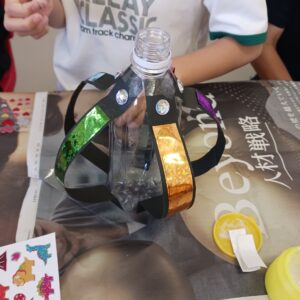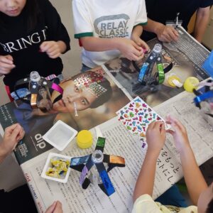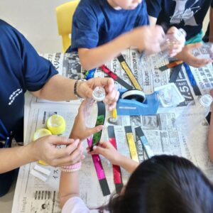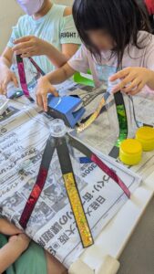 5枚の画用紙をどんなバランスでペットボトルにつけるかも、自分たちで考えてもらいましたよ。