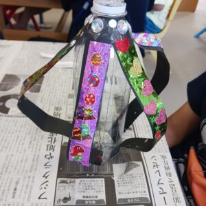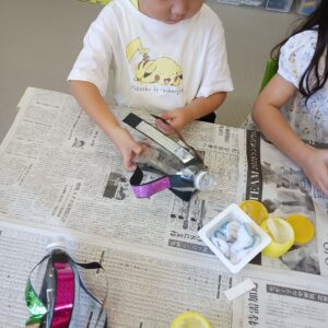 次に、キラキラ折り紙を貼り付けた画用紙をペットボトルにペタペタ♪