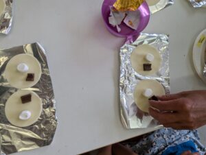 つづいて、チョコと半分に切ったマシュマロをぎょうざの皮に乗せていきます。
