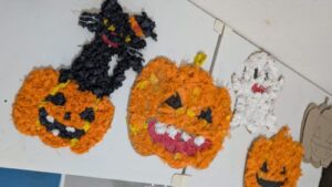 今日は、みんなで壁面工作〔ハロウィン〕お化けモンスター作りを行いました。