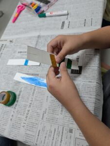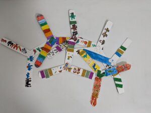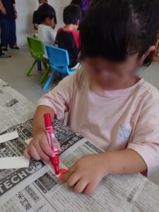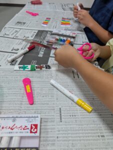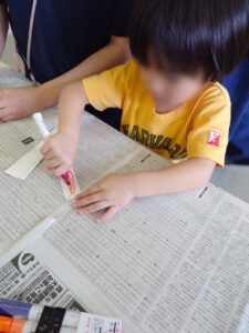 工程はとても簡単で、牛乳パックで作ったブーメランにシールを貼ったり、好きな模様や色を塗って完成です。