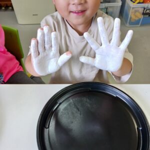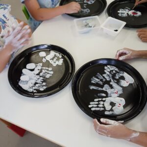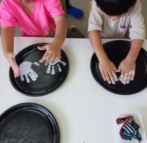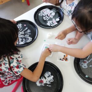 最初は白いおばけを作るために、手に絵の具をたっぷり塗って・・・ペタッ!!