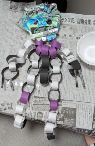 たくさんの画用紙のリングを繋いでガイコツを作ります。