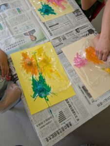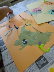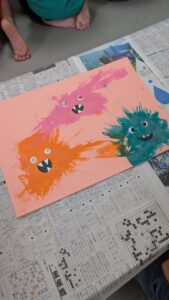 絵の具を綿ボールに染みこませ、絵の具が飛び散らないようにラップをし、上から叩いて色んな形のモンスターを作りました