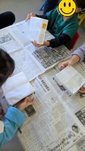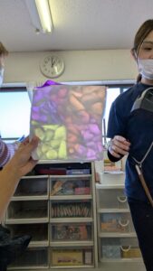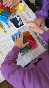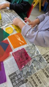 次に表側に色のついたセロファン紙を貼り付けていきますが、自分達の好きな色を使い