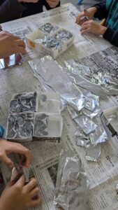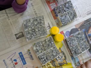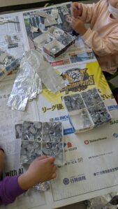 次にアルミ栢を指やマジックのペンを使って丸く丸めて、ケースに詰めていきました。