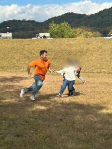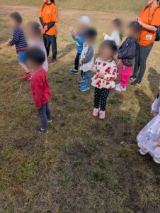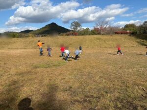 自然学習センターの見学のあと散策しながら芝生広場へ移動です。 芝生広場では、スタッフと追いかけっこをして元気いっぱいに走りまわりました。