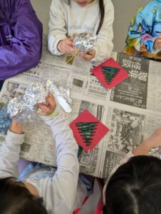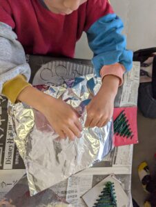 シルバーに輝くベルは、皆上手にアルミホイルをかぶせてくれましたよ!好きに飾りつけが出来ると聞くと、嬉しそうにパーツを選んでいました。