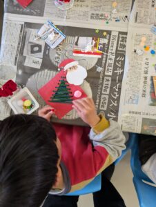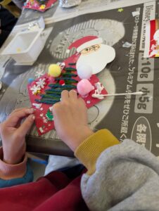 ツリーにもキラキラのパーツやポンポンなど飾り付けます。大胆に配られたパーツをどんどん貼り付けるお友だちもいれば、じっくり考えて一度パーツを置いてみて「ここにする!」と決めてからやっとボンドをつける慎重派のお友だちもいました!
