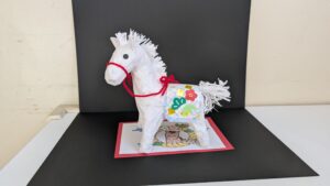 馬の背中に乗せる「くら」には模様を描き松竹梅の飾りを貼り、お馬さんの背中にボンドで貼りつけます。