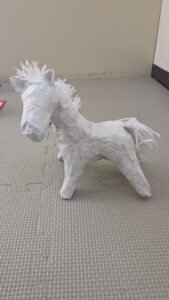 「張り子」は、スタッフが新聞紙で形を作り、その上に半紙をちぎった物を洗濯のりで貼り重ねてと作ったものを使っています。