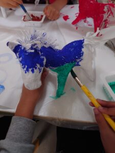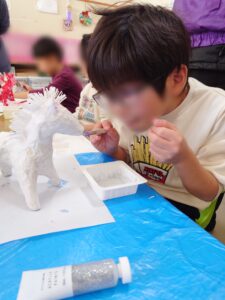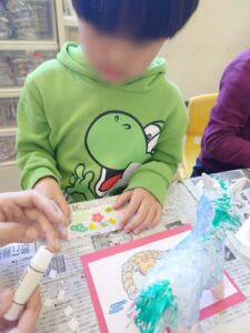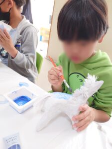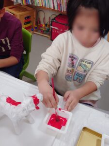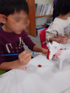 小学生のお友だちは絵の具で張り子に色を付けました。