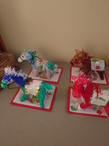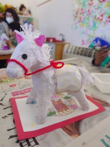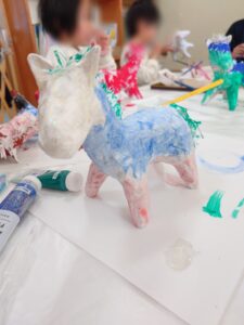 完成するとみんなに作品を発表してもらいました。「くらの模様が気に入ってる!」「青い色が好き!」