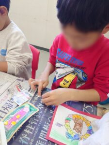 しっかり塗り込めるようになってきたお友だち、余白にお正月らしく羽子板やだるまの絵を描いてくれるお友だちももいましたよ!