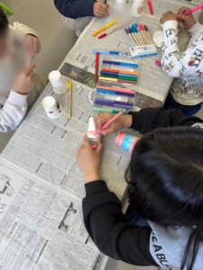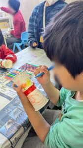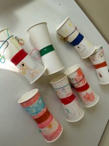 最初に紙コップに絵を書いたり、色塗りをして自分オリジナル飛行機を完成させていきました。