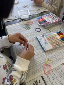 好きな色の輪ゴムを4つ選び、繋げていきました。