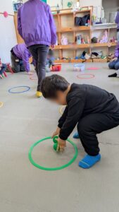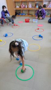 そして、いろいろな色の入ったカラーボールを自分たちで仕分けしながら、同じ色のフープの中にマッチングして置いていきます。